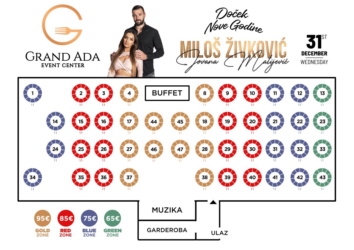 Cena po osobi se kreće od 65€ do 95€ u zavisnosti od pozicije stola u samoj sali i uključuje elegantno mesto za sedenje, svečanu večeru na bazi švedskog stola i all inclusive ponudu pića tokom čitave večeri, (vidi na mapi).