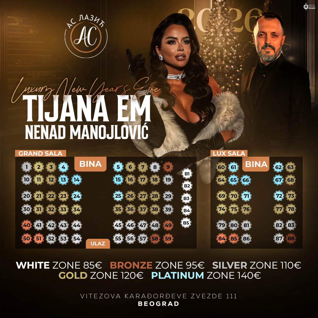 U toplom i glamuroznom okruženju restorana, dočekaćete 2026. godinu uz Nenada Manojlovića i Tijanu Em, izvođače poznate po energiji, emociji i nastupima koji pretvaraju svako veče u spektakl.